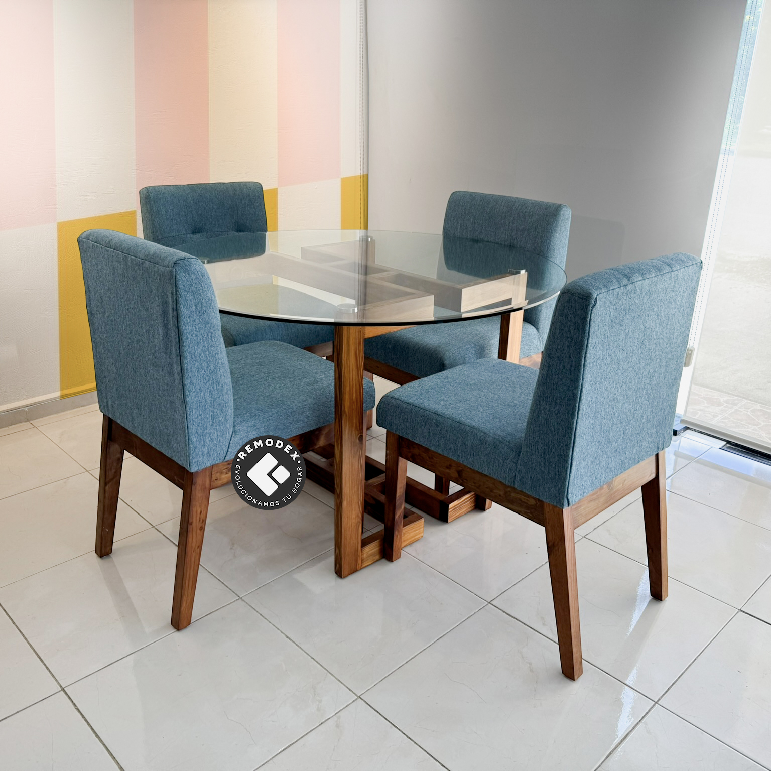 Estructura solida de pino, cubierta de cristal 10mm circular y tapizado en tela de lino, acabado final poliuretano