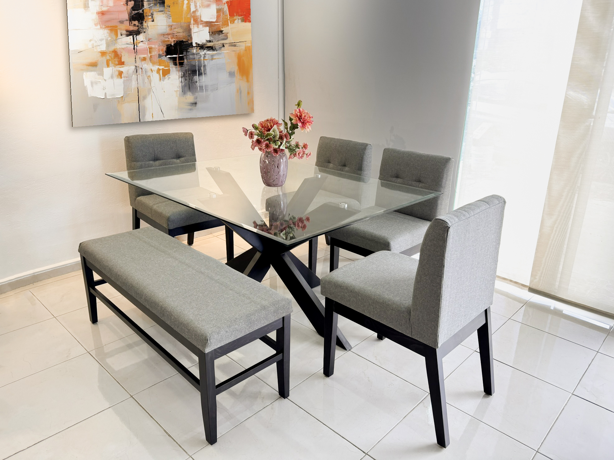 Estructura solida de pino y cubierta de cristal de 10mm con biselado de 1", sillas con tapizado en tela de lino, acabado final poliuretano