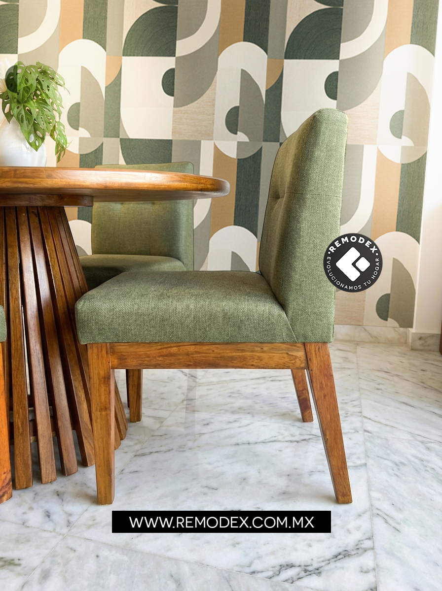 Estructura solida de madera de pino con acabado poliuretano y sillas tapizadas en tela de lino